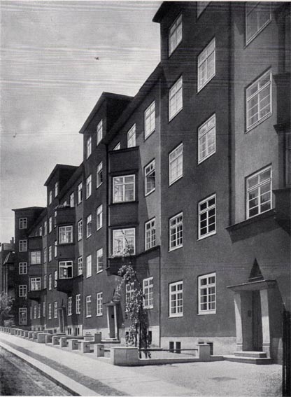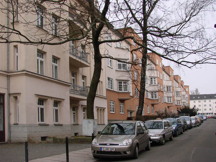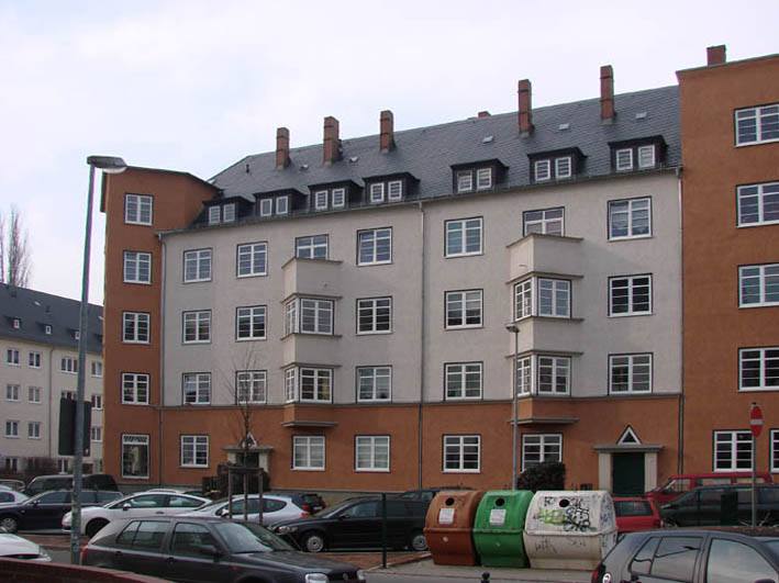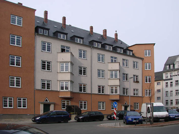 Gebaut wurde die Wohnanlage 1926/27 durch den Zusammenschluss von Handwerkern und Architekten zur "Zentralbaugesellschaft, nach Plänen von Willi Jänicken und Gotthold Puschmann. Sie galt als wegweisend für das "Neue Bauen" in Chemnitz in den 1920er Jahren. Die Wohnanlage trägt dabei aber auch Stilelemnte des Expressionismus und des Art-Deco. |
