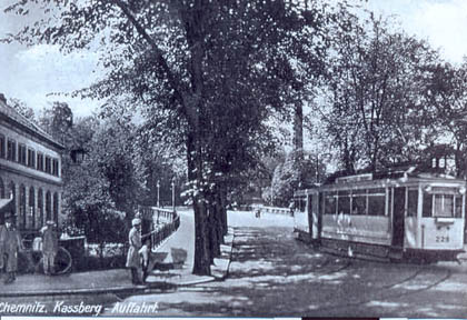 Schließlich fuhren bald zwei Straßenbahnlinien über die Kaßbergauffahrt: die Linie 8 kam von Ebersdorf - über die Frankenberger Straße, Hainstraße, Dresdner Platz, Johannisplatz, Theaterstraße, Kaßberg, Kaßbergauffahrt, Weststraße (Kochstraße) und die Linie 10 verkehrte vom Haptbahnhof über Bahnhofstraße, Königstraße, Markt, Theaterstraße, Kaßbergauffahrt bis zur Weststraße (Kochstraße) |
